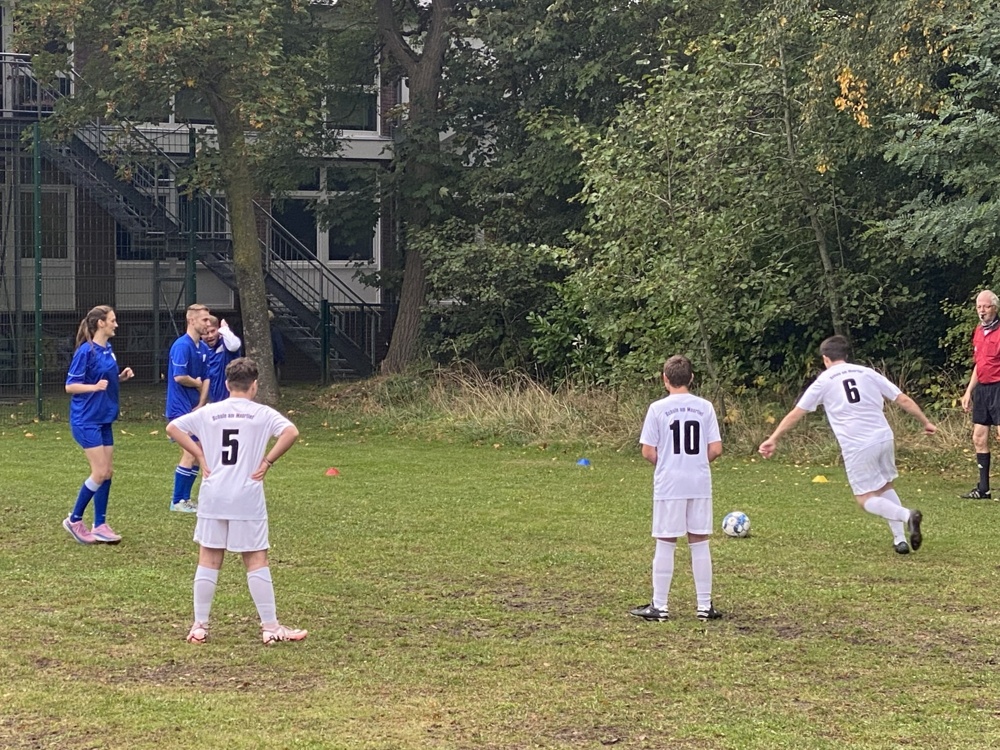 Vor den Herbstferien fand ein spannendes Spiel zwischen unserer Fußballmannschaft gegen eine Auswahl des Kollegiums auf unserem Schulhof statt. Die ganze Schule schaute zu, feuerte an und genoss die ausgelassene Stimmung mit Popcorn und Anfeuerungsgesängen.